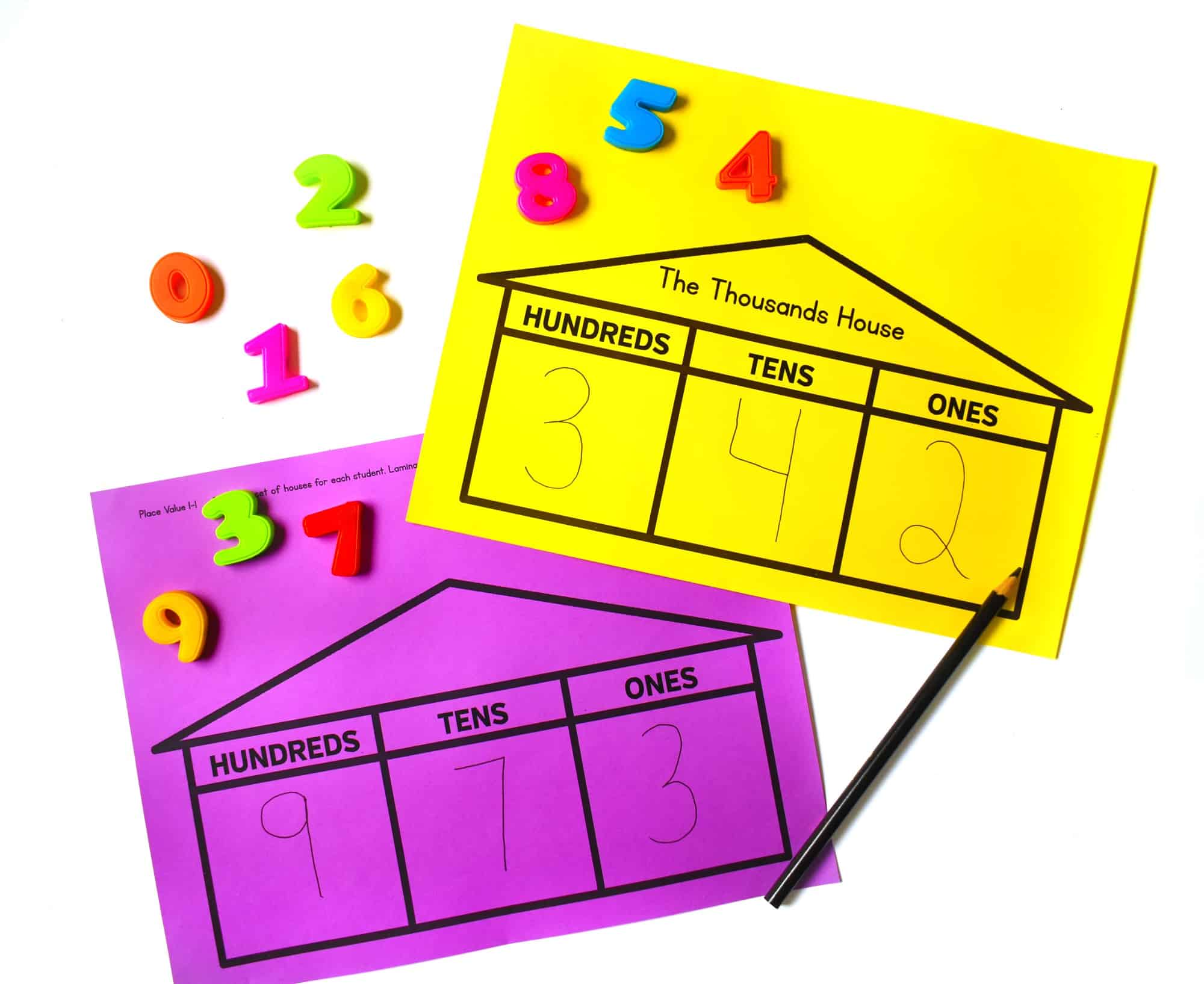 Another reading and writing numbers place value intervention that my students enjoy is a place value fan. They can move the numbers around, so that they can build and read a variety of numbers. If you do this lesson, be sure to NOT laminate the numbers. Mine were way too slippery. The great thing about the fans is that you can have students create any size number.